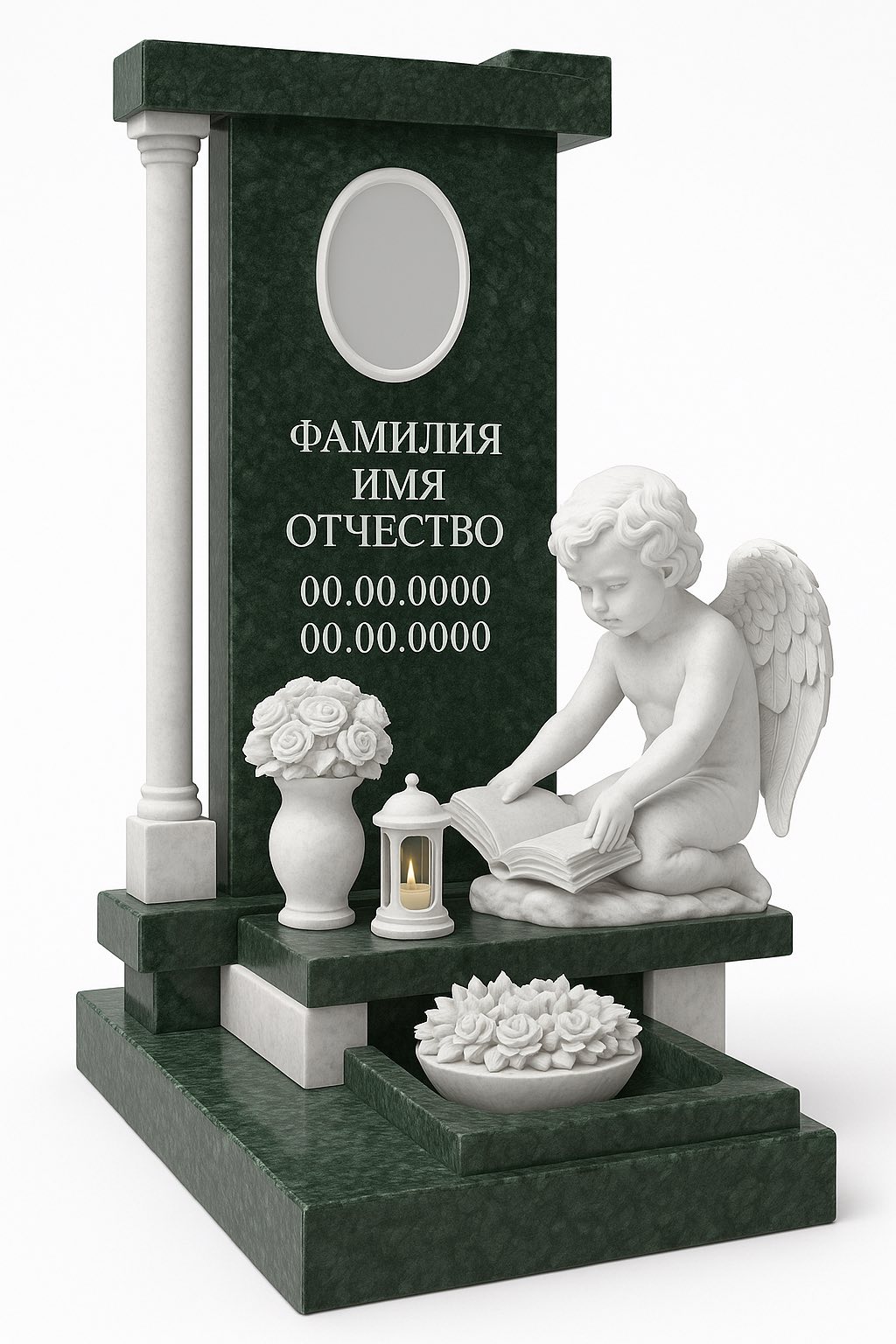 Элегантный памятник для ребёнка, выполненный в сочетании тёмно-зелёного гранита и белого камня, наполнен светлой символикой и теплом. Центральным элементом композиции выступает скульптура ангела с книгой, установленная на специальной площадке, оформленной гранитной колонной и массивным угловым основанием.